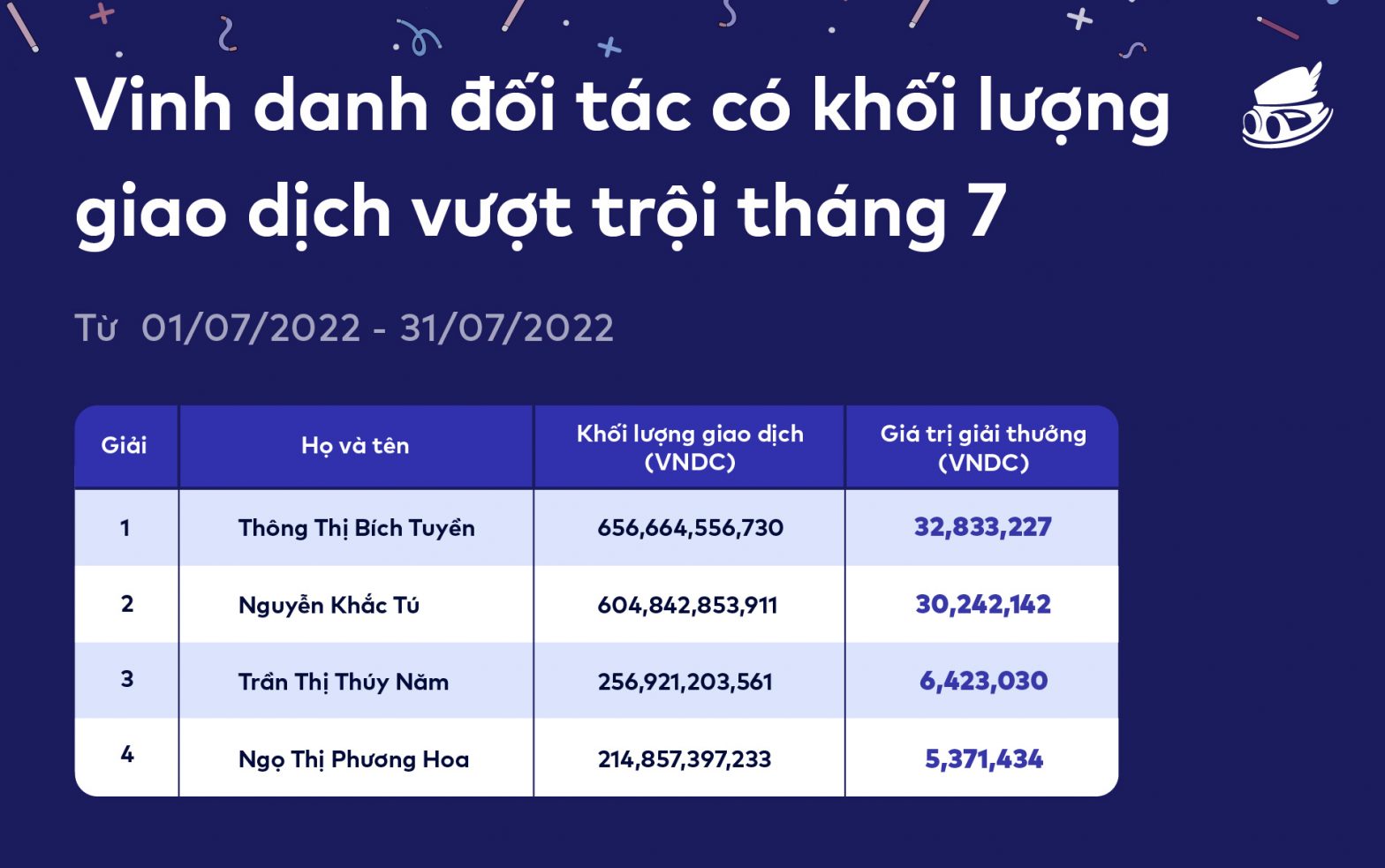 Chúc mừng Đối tác Đặng Thị Nhật Lệ và Thông Thị Bích Tuyền với khối lượng giao dịch lần lượt là 656 tỷ VNDC và 605 tỷ VNDC đã xuất sắc cán mốc thưởng 10%, nhận thưởng trị giá mỗi người hơn 30 triệu VNDC
