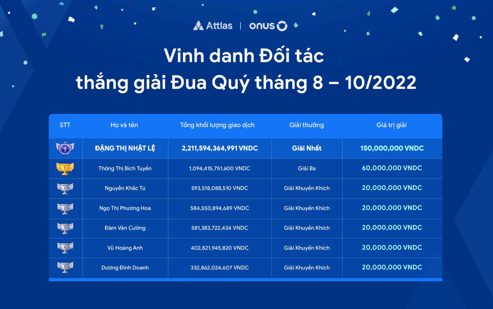 Nhằm vinh danh top đối tác vượt trội nhất, Attlas và ONUS xin công bố danh sách các đối tác thắng giải Đua top khối lượng giao dịch Futures cá nhân Quý III (tháng 8 – 10/2022)