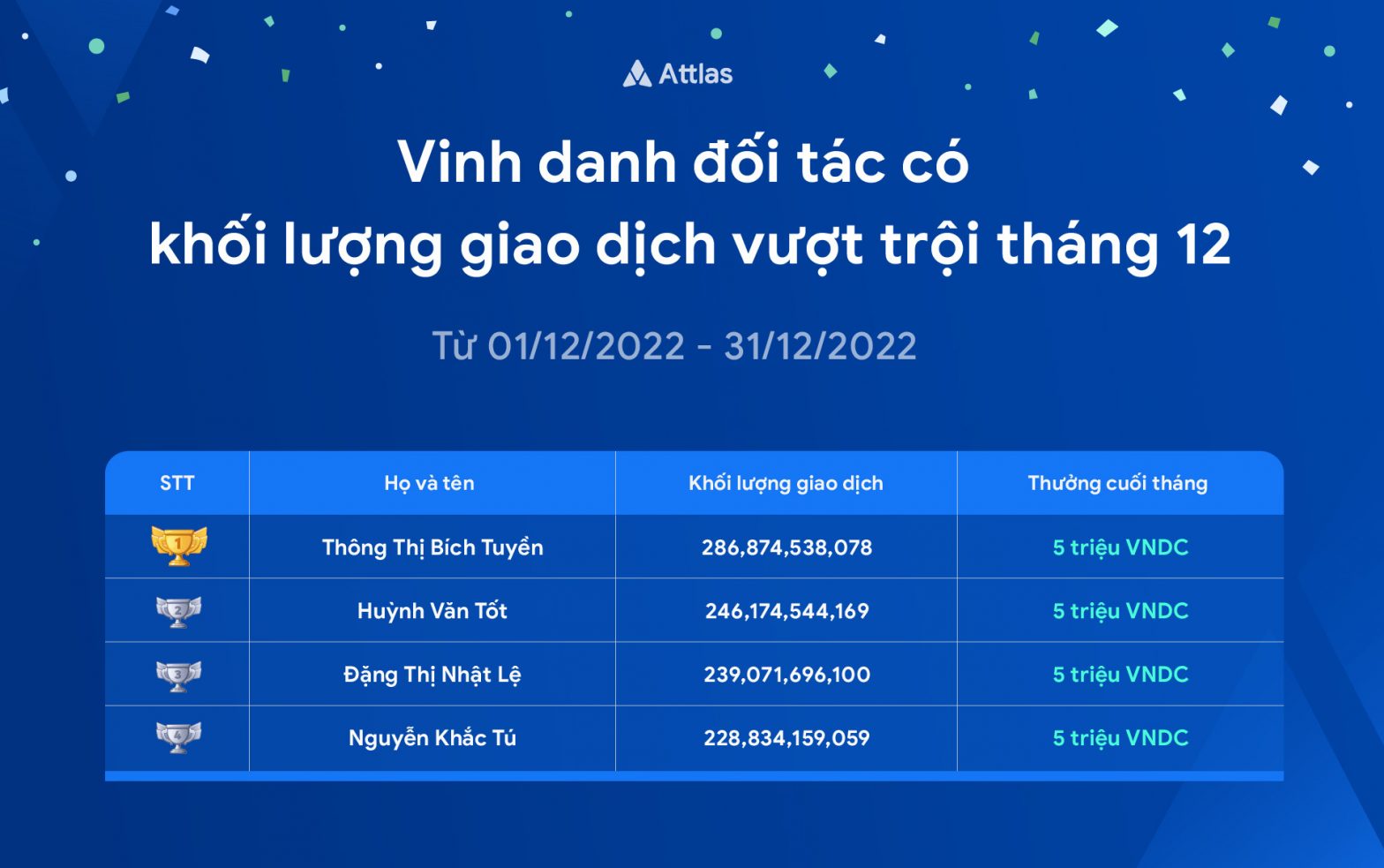 Vinh danh đối tác có khối lượng giao dịch vượt trội tháng 12 Chúc mừng Đối tác Thông Thị Bích Tuyền đã xuất sắc dẫn đầu BXH Đối tác trong tháng 12!
