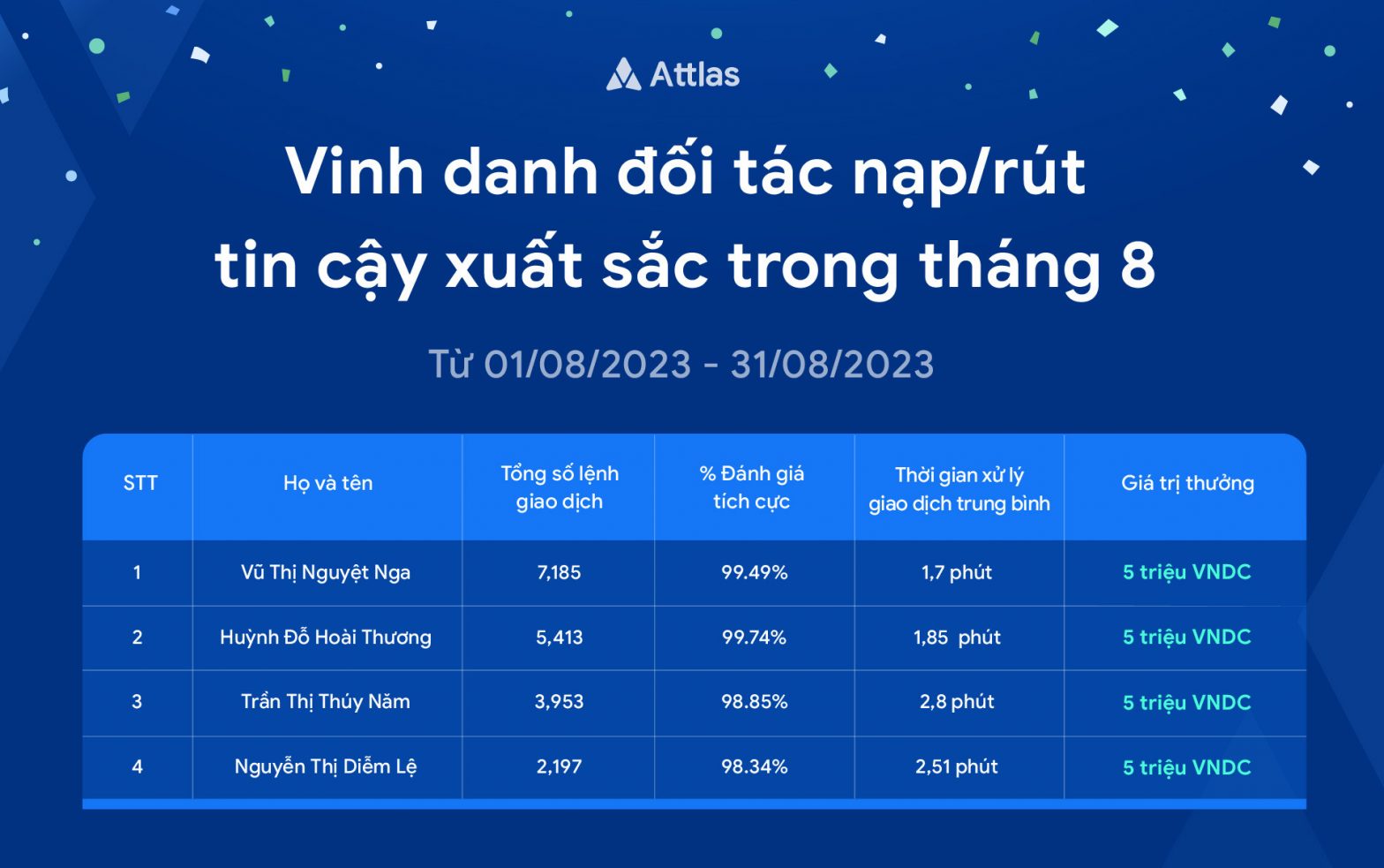 Vinh danh đối tác nạp/rút tin cậy xuất sắc tháng 8