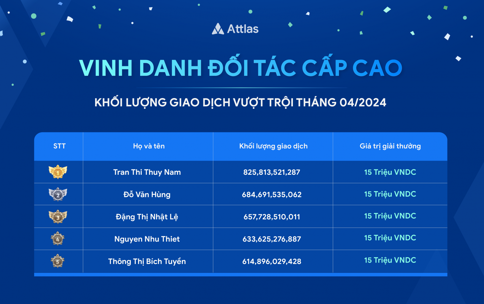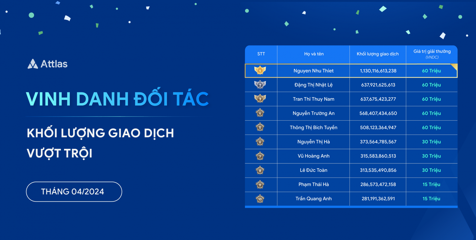Chính sách thưởng cá nhân theo từng mốc khối lượng giao dịch người dùng cụ thể dành cho đối tác diễn ra từ 01/04/2024 – 30/04/2024 đã chính thức kết thúc, với kết quả ghi nhận như sau: