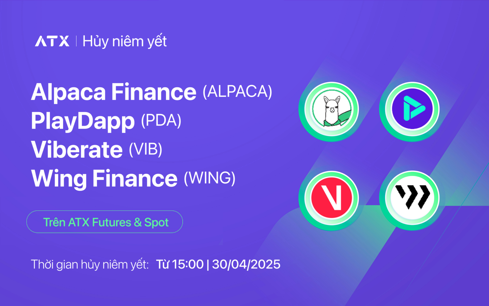 Hủy niêm yết ALPACA, PDA, VIB, WING token trên ATX Spot và Futures từ 15:00 ngày 30/04/2025.