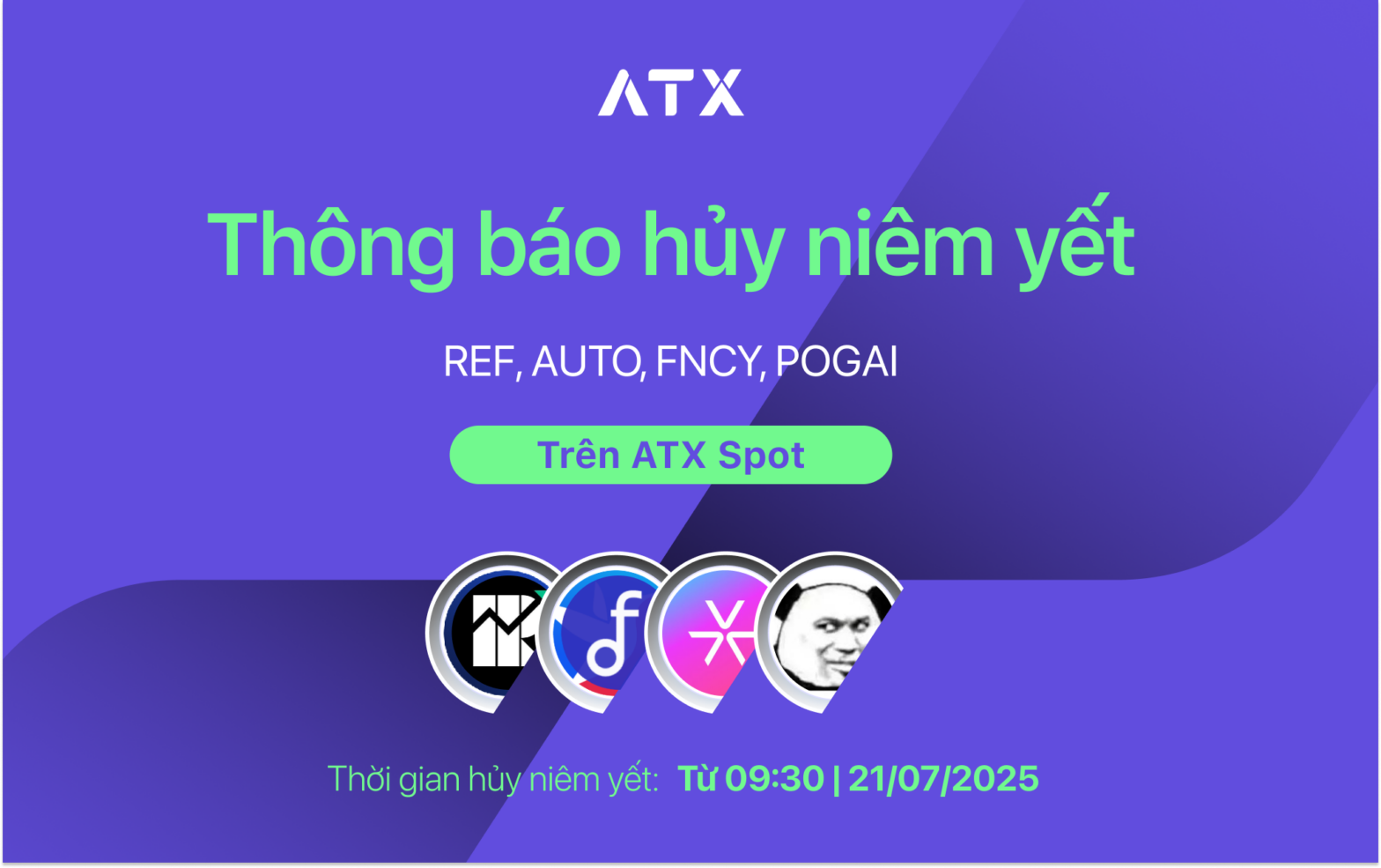 Hủy niêm yết REF, AUTO, FNCY, POGAI Token trên ATX Spot từ 09:30 & 09:45 ngày 21/07/2025.