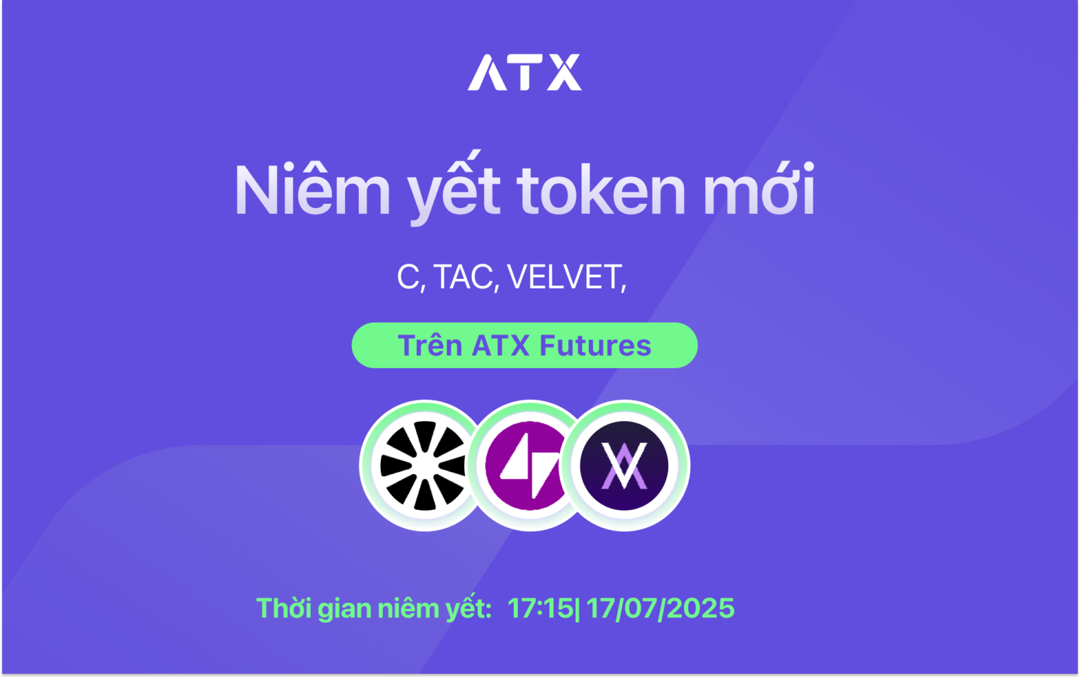 ATX chính thức niêm yết C, TAC, VELVET token trên ATX Futures từ 17:15 ngày 17/07/2025.
