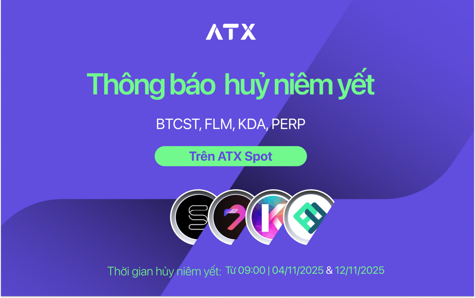 ATX thông báo lịch huỷ niêm yết BTCST, FLM, KDA, PERP token trên ATX Spot từ 09:00 ngày 04/11/2025 & 12/11/2025