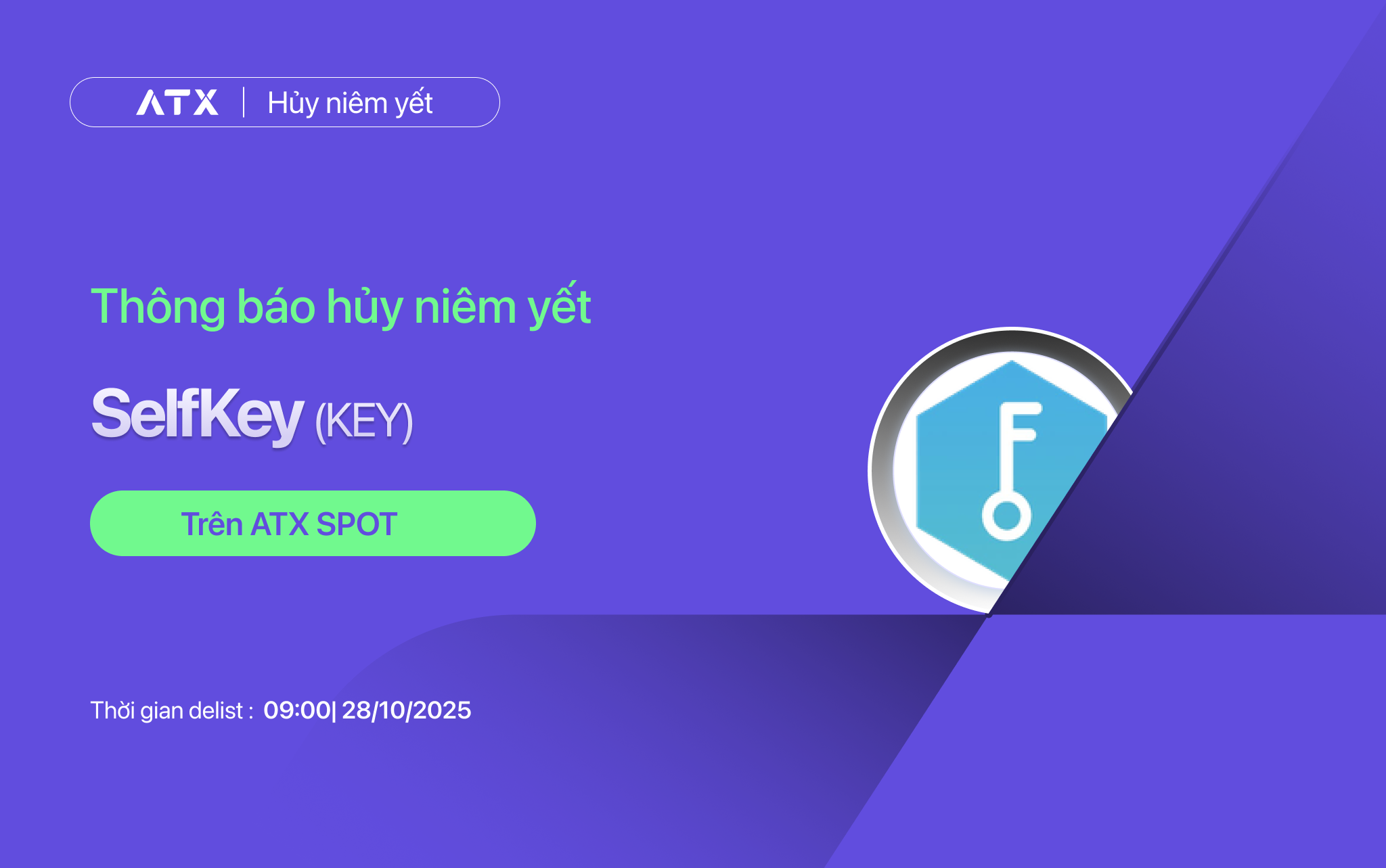- Các cặp giao dịch: KEY/USDT, KEY/VNDC sẽ bị huỷ niêm yết trên ATX Spot. Các lệnh được đặt sẽ tự động huỷ sau khi các cặp giao dịch bị huỷ niêm yết.