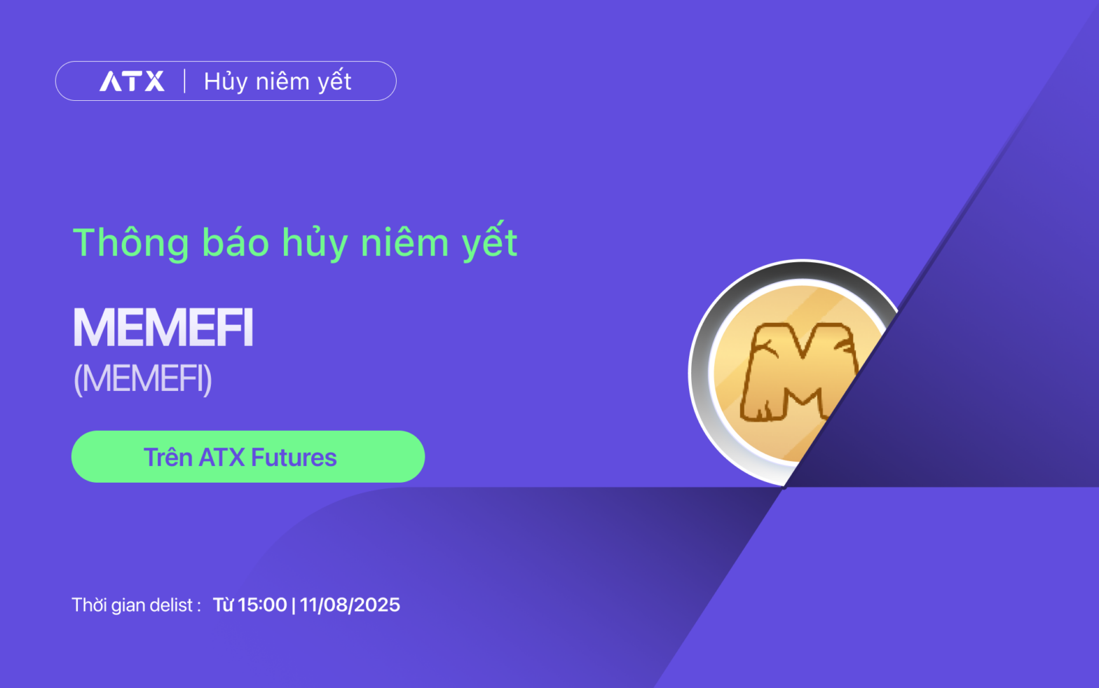 Hiện nay, các sàn giao dịch quốc tế đã có kế hoạch gỡ bỏ giao dịch với MEMEFI token. Theo đó, ATX xin thông báo: Huỷ niêm yết các cặp giao dịch MEMEFI/USDT, MEMEFI/VNDC trên ATX Futures.
