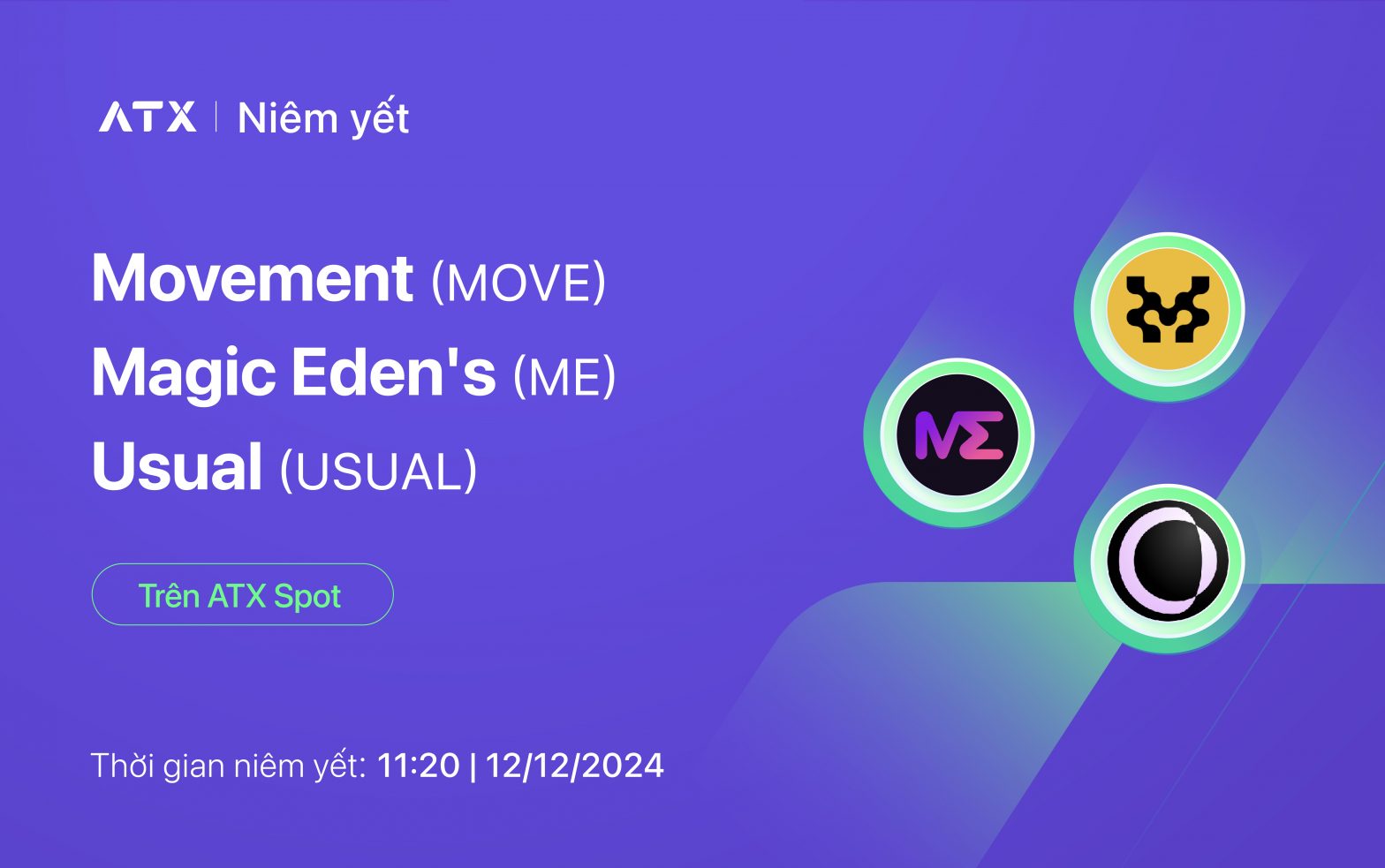 - Từ 11:20 ngày 12/12/2024, ATX sẽ mở giao dịch Spot và hỗ trợ các cặp giao dịch MOVE/VNDC, MOVE/USDT: ME/VNDC, ME/USDT; USUAL/VNDC, USUAL/USDT.