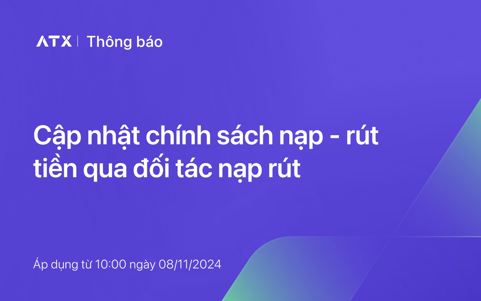 Để tối ưu hóa trải nghiệm giao dịch của khách hàng, ATX xin thông báo cập nhật chính sách nạp rút với nội dung chi tiết như sau: